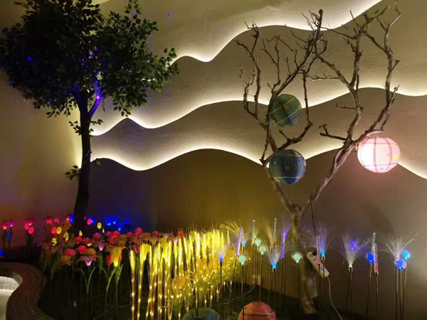 中筑景觀的這面墻壁利用了線條燈打造出流暢的線條,結合設計更顯層次感。線條燈主要用在戶外景觀照明,亮化工程,市政工程,室內舞臺燈光等領域。它的發展趨勢主要是外形輕薄化,價格平民化,應用簡單化,壽命加長化等。再加上亮化設計,可以將其發揮到極致。其次我們還利用了底下的空間擺放一些景觀燈,以及照樹燈做展示。