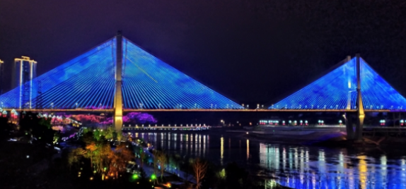 橋梁夜景照明設計需要考慮融進更多的,現代元素以及與現有城市布局的整體融合。展現出時代性、創新性、高科技化等特色。現在的橋梁,多系現代化的鋼索斜拉橋,有雙塔斜拉、單塔斜拉,斜拉橋的外形特色的于拉索。其設計應將重點突出這一特色為主,用不同的燈具及匠心獨具的藝術手法,使斜拉橋如一架碩大的豎琴屹立在大江、大河之上。