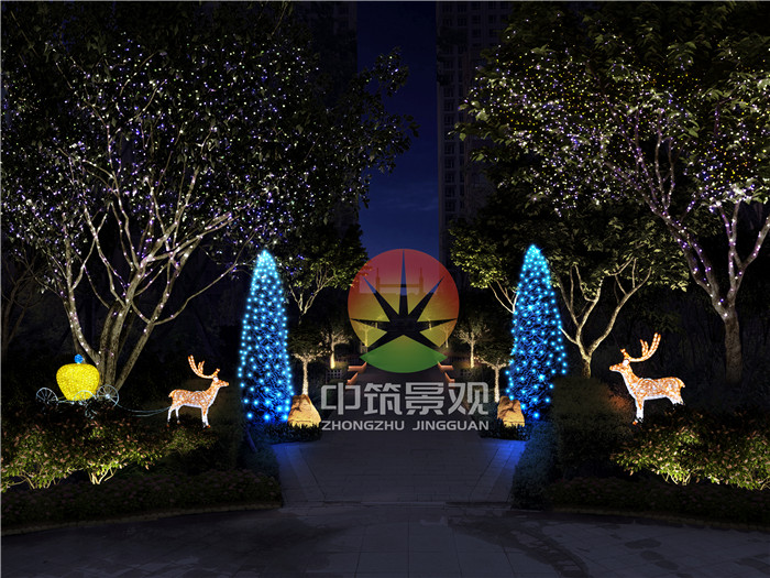 園林綠化照明設計,以中軸線對稱式構圖 ,營造寧靜舒適的小區夜景氛圍,點綴梅花鹿造型燈光小品 ,增添生動性、趣味性。