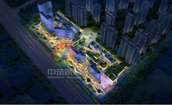 鳥瞰視角(整體以暖光色為基調(diào),營(yíng)造溫馨氛圍;商業(yè)裙樓以彩色光為喚醒,渲染商業(yè)空間的豐富性、活躍性。建筑、景觀上下渾然一體而又層次分明。)