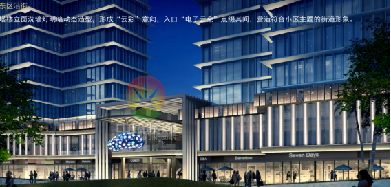 沿街視角(從車行視角考慮,設(shè)計(jì)“云彩”與“星空”的意向,商業(yè)裙樓以3000K為主,風(fēng)鈴幕墻光色緩慢漸變,表現(xiàn)商業(yè)空間的繁華與豐富多彩,立面以4000K為主,表現(xiàn)建筑的現(xiàn)代感 ,入口以彩色投影特色表達(dá) ,吸引客流。)