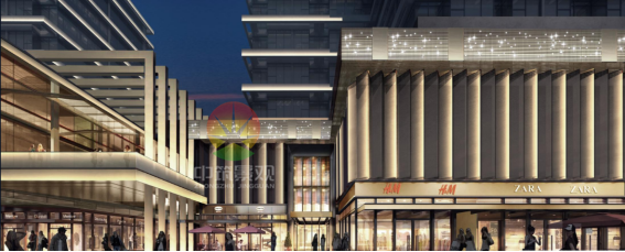 西區(qū)內(nèi)街(彩釉玻璃幕墻結(jié)合洗墻燈,光色清新而又唯美,地面互動(dòng)投影加強(qiáng)人與燈光的互動(dòng)性,冷與暖,動(dòng)與靜,生動(dòng)與活潑形成多彩的商業(yè)內(nèi)街空間。)