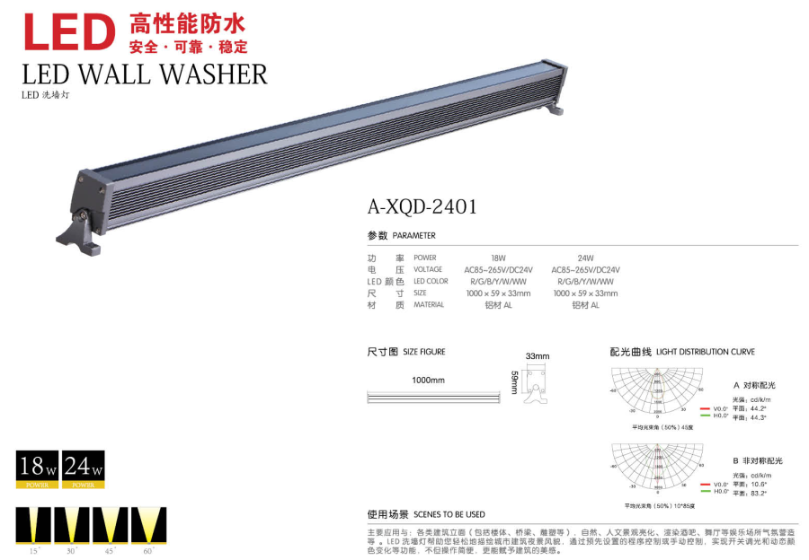 洗墻燈 A-XQD-2401使用場景主要與各類建筑里面(包括樓體、橋梁、雕塑等),自然、人文景觀亮化、渲染酒吧、舞廳等娛樂場所氣氛營造等。幫助您輕松地描繪城市建筑夜景風貌,通過預先設置的程序控制或手動控制,實現開關調光和動態顏色變化等功能,不但操作簡單,更能賦予建筑的美感。